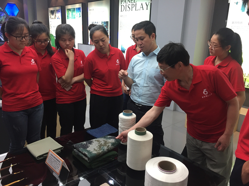 在参观期间,公司向团队展示了该公司所生产的各种聚酯膜、阻燃共聚物等产品以及应用的平板显示屏、键盘等。此外,最特别的是该公司是一家有生产军用产品的军工合作企业,生产了各种特种用膜以及军用材料及汽轮机核心的玻璃钢大锥环等,令学生大开眼界。