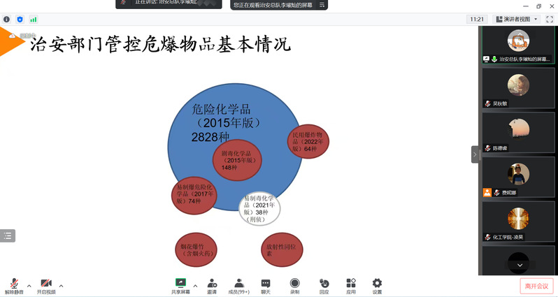 李璀灿生动形象地介绍了危爆物品的定义与分类,并就我国现有的法律法规及行业标准为依据,传达“安全第一、预防为主、依法治理、系统治理”的治安管理原则,要求高校与企业强化主体责任,从制度建立、购买、运输、储存、使用、处置、信息发布等方面进行全流程管控。对于日常管理中经常出现的问题,他也进行了总结,并针对“制度不健全、流向不完整、账物不相符、储存不合规”的实验室管理漏洞一一提出建议,从治安角度和专业角度给在场师生普及了易制爆危险化学品科学管理的必要性。